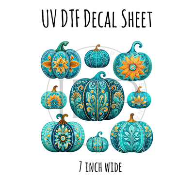 7"x7"- #29- Turquoise Fall Pumpkins - UV DTF Decal SHEET