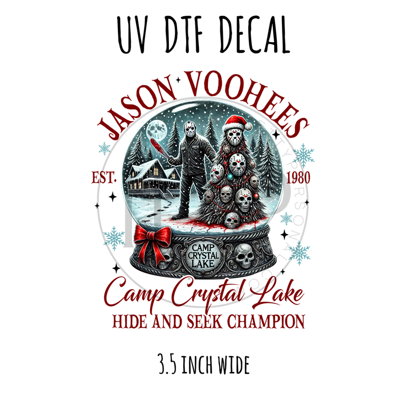 #649 Horror Christmas Snow globe Camp Crystal Lake *MUST READ LISTING- 3.5 inch wide UV DTF decal